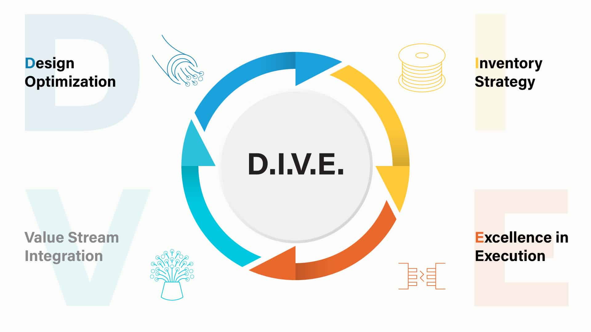 We’re more than a manufacturer. We’re your supply chain partner. And that starts with our DIVE process, a proven framework to help customers improve design, manage inventory, integrate workflows, and execute with confidence.